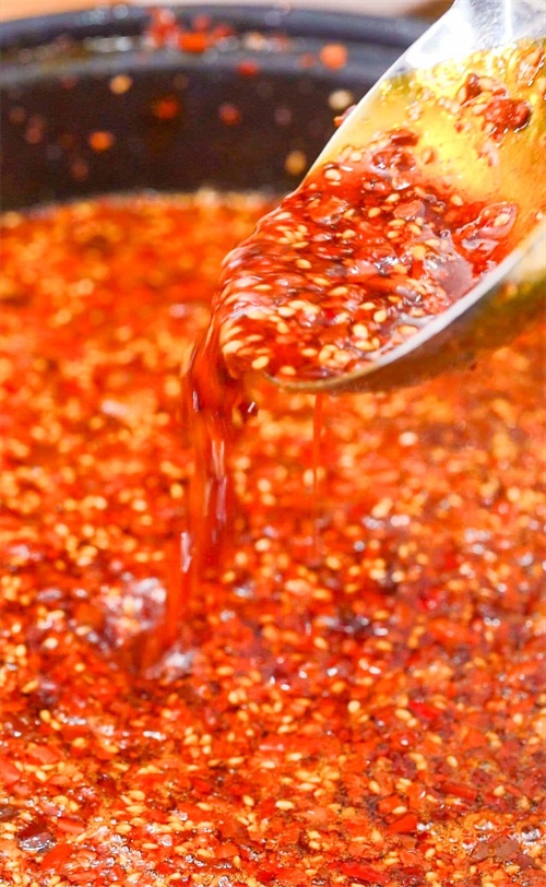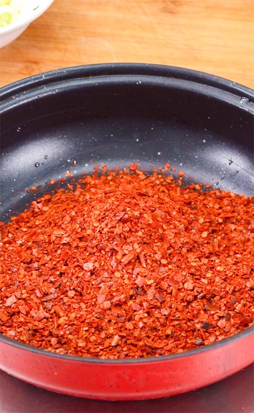这样用热油浇过之后,辣椒面就呈现出辣、咸、甜3种美味,吃多了后嘴里也不会发黏。