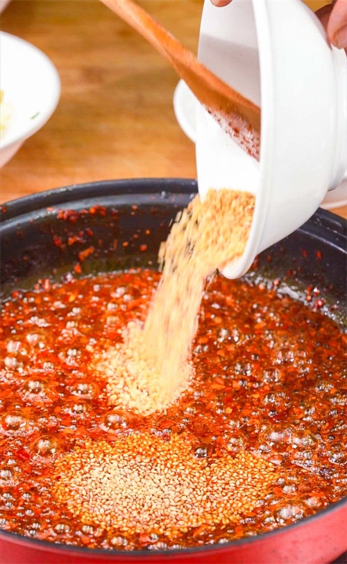 3 撒入白芝麻与花生碎搅拌,晾凉后可以品尝一下辣椒油。如果不够咸也可以多撒一些盐,或是味精提鲜。