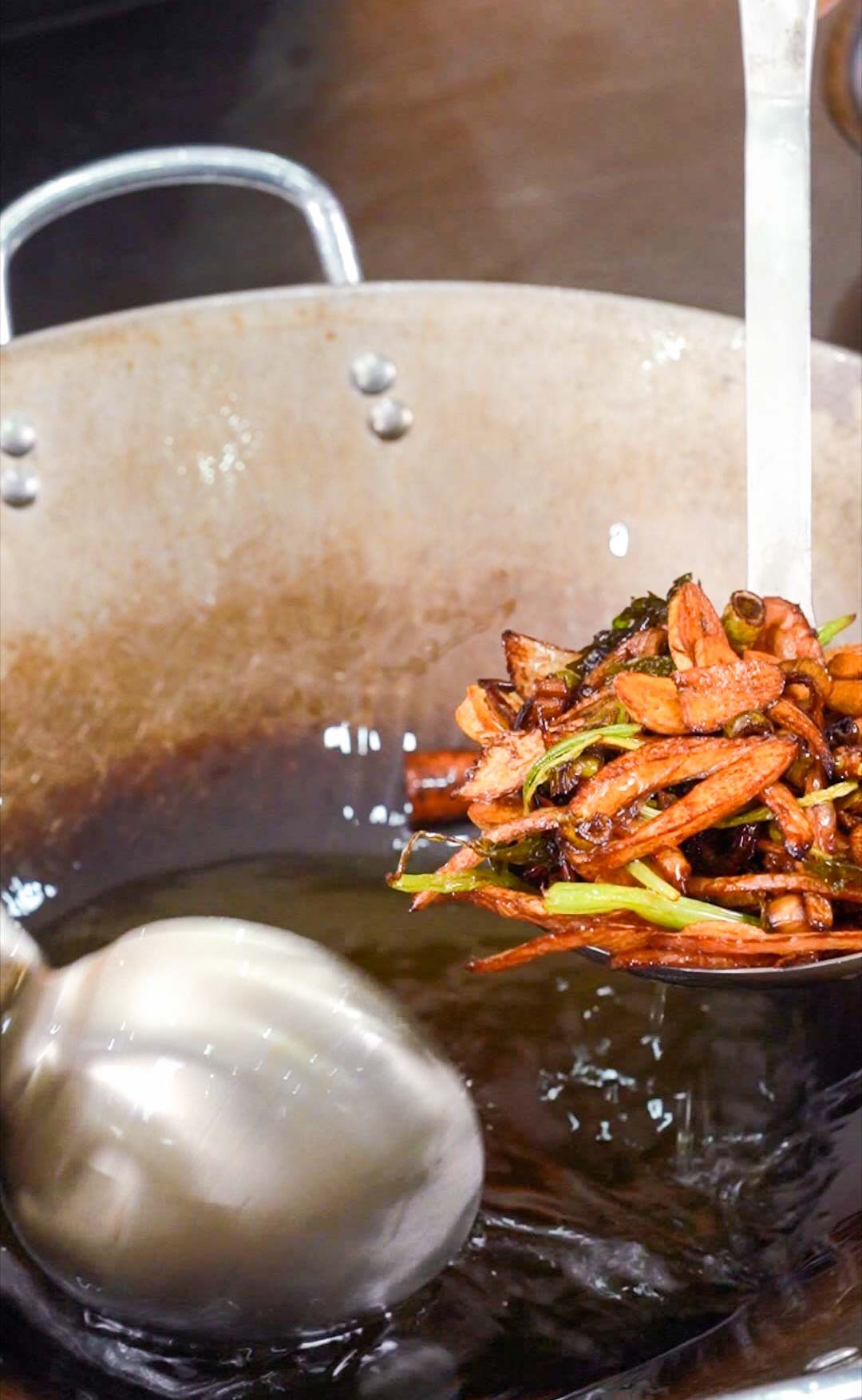 调配完辣椒面后观察刚才慢炸的调料,如果调料被炸干则用漏勺将调料捞出。如果没有炸干,火调大一些将调料炸干后捞出调料。这时油中就充满了调料的香味,继续开中火烧热并下入竹筷子观察。