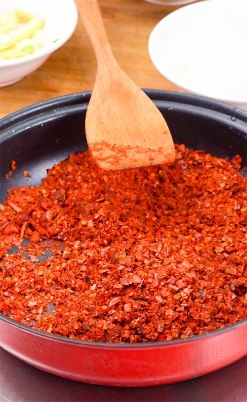 平时自制辣椒油时,我们会准备一个不锈钢碗放入辣椒粉,然后把烧热的油浇入碗中。这样做的缺点是辣椒粉遇到热油容易被炸糊发苦。想要解决这一问题只需要在辣椒粉中撒入少量的水搅拌就可。