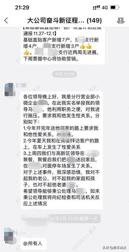 近日,一则关于银行已婚女员工举报领导施压发生性关系的消息,在网络上引发关注。网传截图显示,12月2日晚9点多钟,一位头像是女性的徐姓员工,在一个149人的工作群@所有人,自称是分行营业部员工,向各位领导实名举报她的领导马某某称其“利用职务之便,对我进行施压,要求我和他发生性关系”。并详细列明了三次发生性关系的时间和地点。