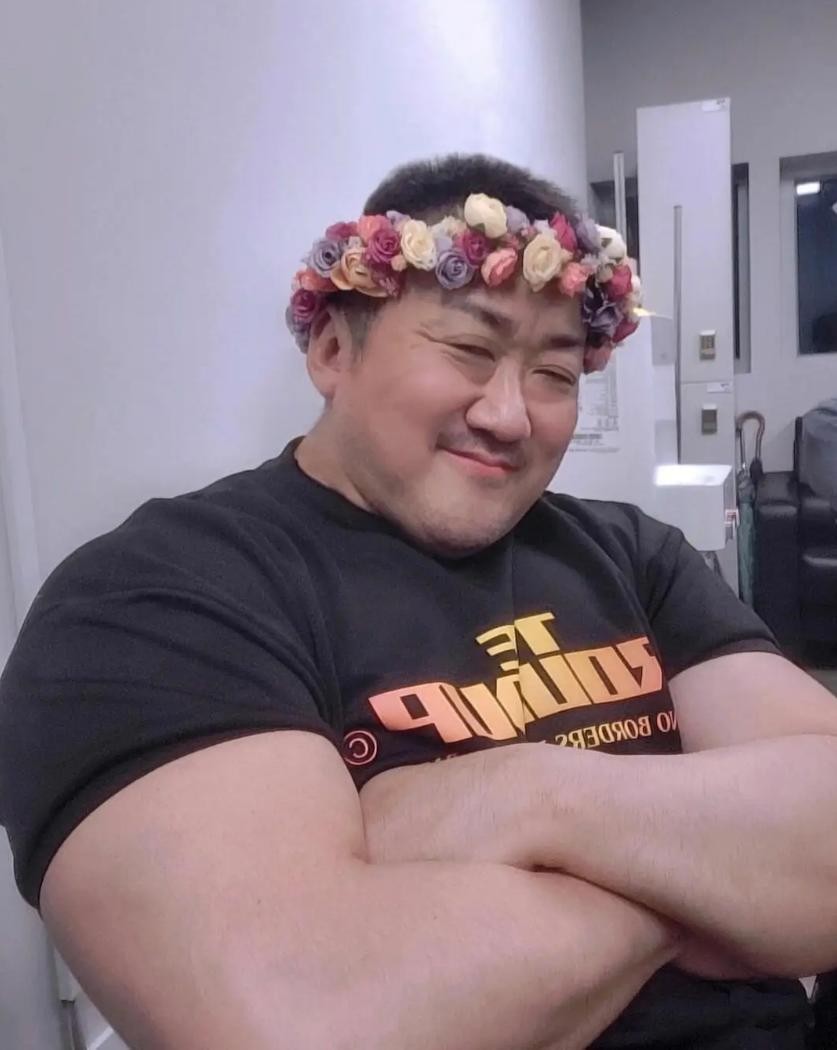 在照片中,马东锡站在镜头前,自信地展示着他那健硕的身材。他的手臂线条清晰可见,肌肉发达,仿佛经过了精心的雕琢。而他的笑容也让人感到亲切和温暖,双眼眯成一条缝,仿佛在向网友们亲切致意。这张照片中的他,与以往电影中塑造的硬汉形象形成了鲜明的对比,展现出了他柔情的一面。