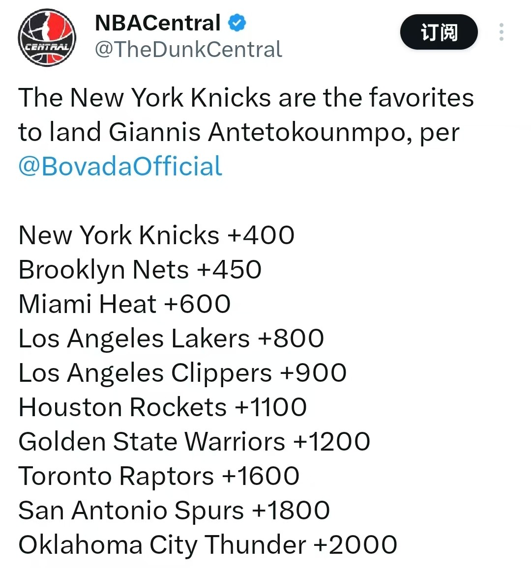 字母哥最新下家赔率已经出炉,纽约尼克斯被视为头号热门下家。纽约这样的大都市,很有利于字母哥提升商业价值。具体赔率排名如下:1.尼克斯、2.篮网、3.热火、4.湖人、5.快船、6.火箭、7.勇士、8.猛龙、9.马刺、10.雷霆。