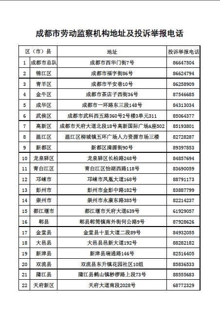 四川新闻网成都1月23日讯(记者 李丹)今日,四川新闻网记者从成都市人社局获悉,市人社局公布成都市劳动监察机构地址及投诉举报电话,劳动者遇到欠薪问题,可以及时拨打这些电话进行维权。