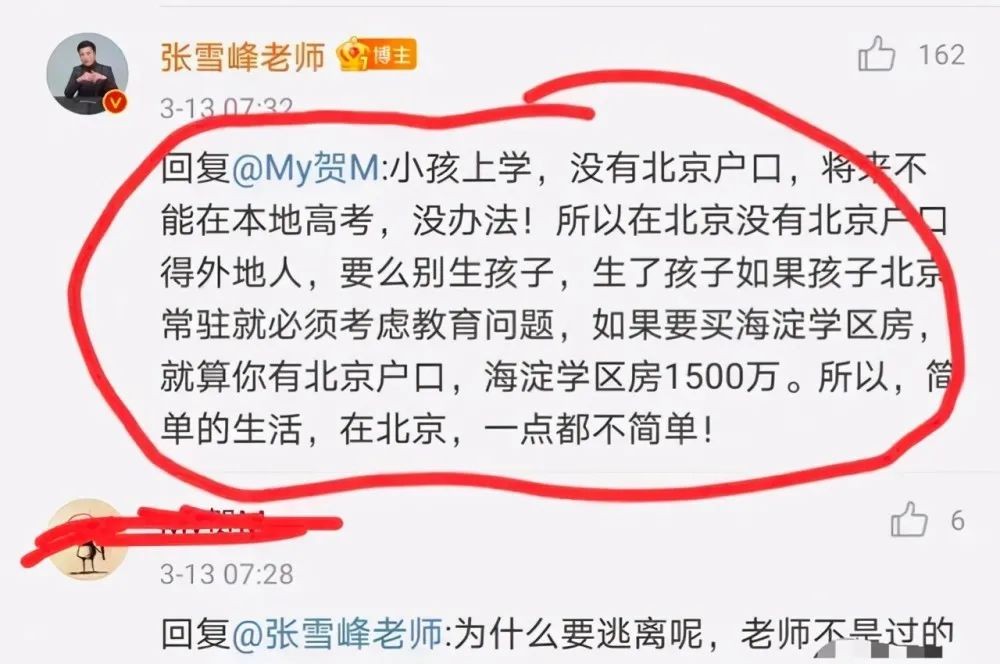 张雪峰在北漂里都不叫千分之一,应该能算上万分之一的人,混得非常好,然而又怎么样呢?到了孩子要上学的时候还是得走……