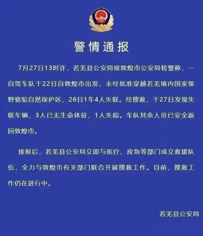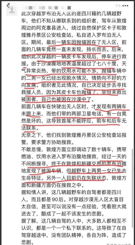 根据警方通报和现场图片显示,这起悲剧事件发生在7月22日至7月27日之间。在车队行驶4天后,有一辆车上4人失联。而报警是1天以后发生的事情。紧接着,警方发现了遇险车辆。其中3人现场死亡,被晒成了人肉干!另外1人则失踪无踪。经过调查和分析,警方认为这起事件主要由以下几个原因导致: