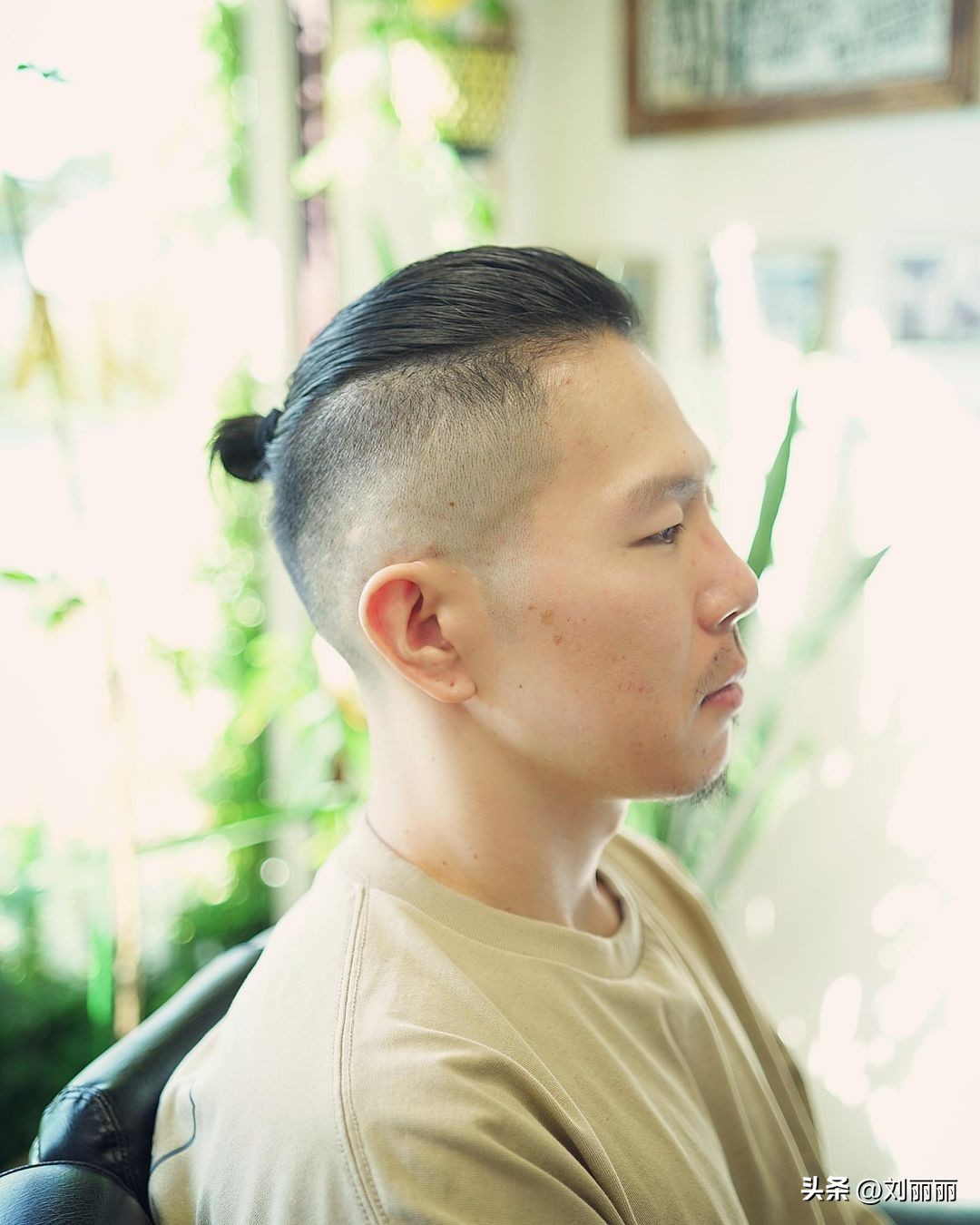 最后带来的是一款头发比较长的男士发型,就是把头顶的部分留长一些,扎一个简单的发髻,周边大概铲短留成三毫米左右的长度,这样的男士半扎发帅气又时尚,喜欢的话记得收藏点赞,想看更多流行时尚发型,别忘了关注我。