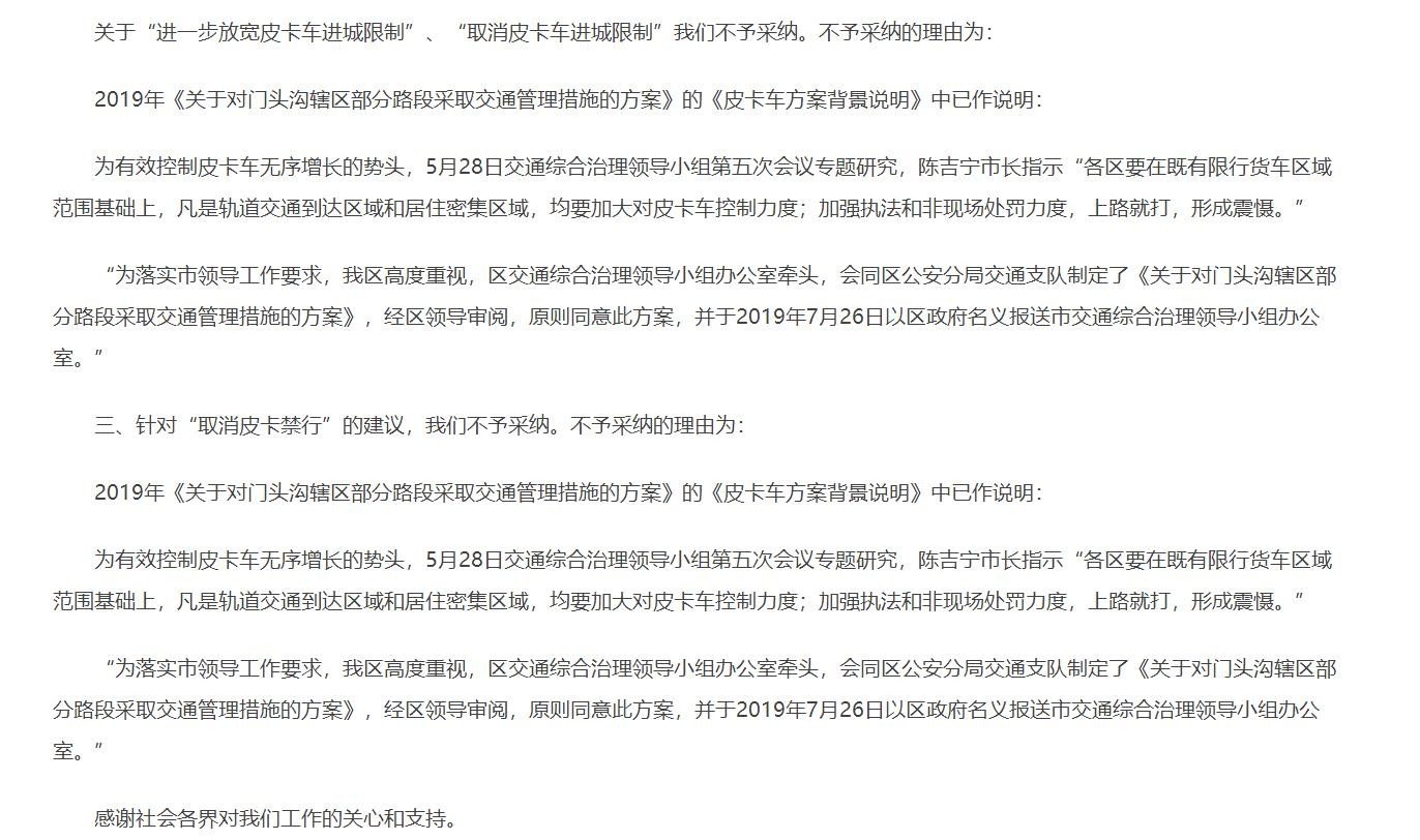 阻碍北京皮卡管理方式调整的首要阻力来源于政策。北京8区于2020年发布的皮卡限行政策并非各区交管部门制定,且绝非依附于某项市级货车管理规定的下属条款,而是由前市长陈吉宁同志直接指示,要求加大皮卡车控制力度。详见于市政府官网的政民互动板块,具体文件为关于对《门头沟区关于对货车和专项作业车采取交通管理措施的通告》公开征集意见的反馈。