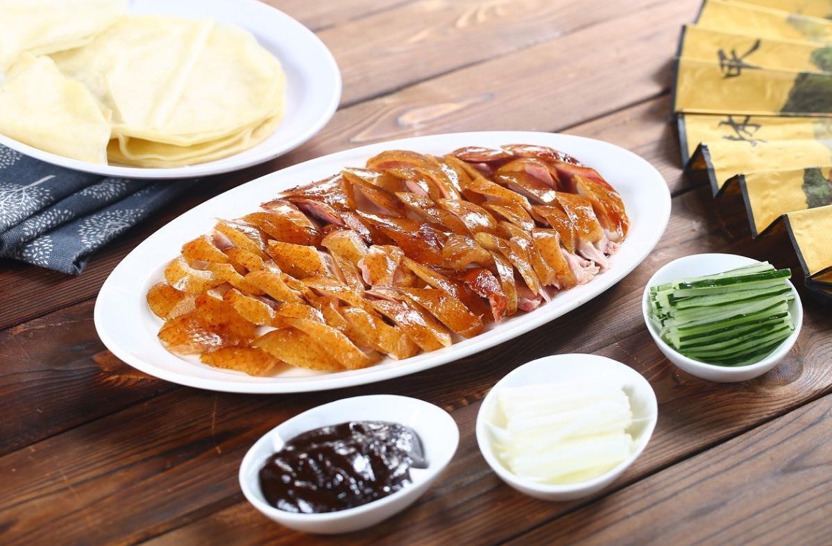 到北京不吃烤鸭,这趟旅程就是不完整的。肥瘦分明,肉质鲜嫩的烤鸭横跨元、明、清三朝,成为宫廷御膳中的必备珍品。而我们现在吃的烤鸭通常以“北京填鸭”为原料,躯体肥硕,烤制之后外焦里嫩,皮层松脆。在搭配的荷叶饼上刷好甜面酱,再卷上几片烤鸭、葱丝、黄瓜条,口感层次丰富百吃不腻!