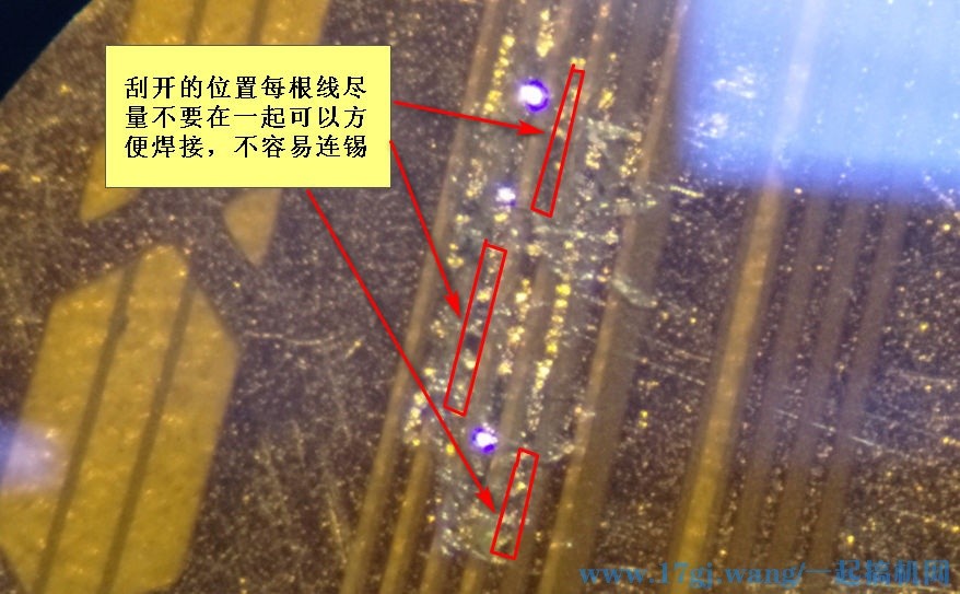 4.在排线断的位置两端找合适位置刮开表面保护层。注意一个技巧就是刮不同线尽量刮的位置远一些,不要离得太近,要不然容易在焊接飞线的时候连锡,导致前功尽弃。