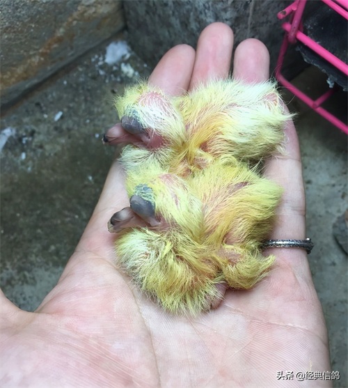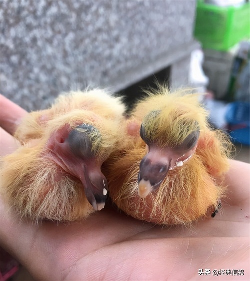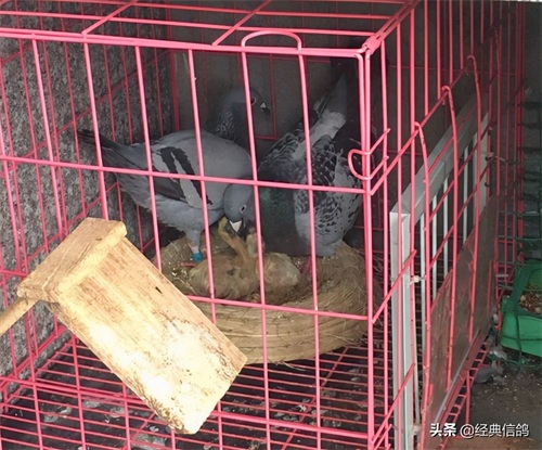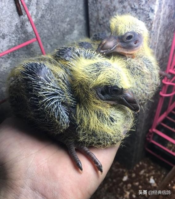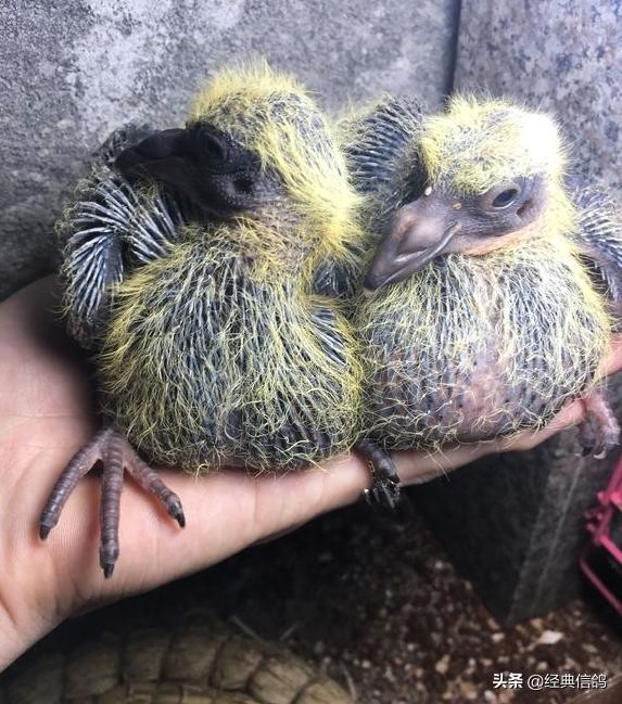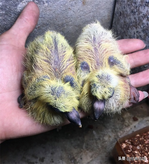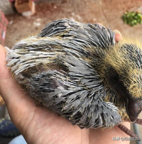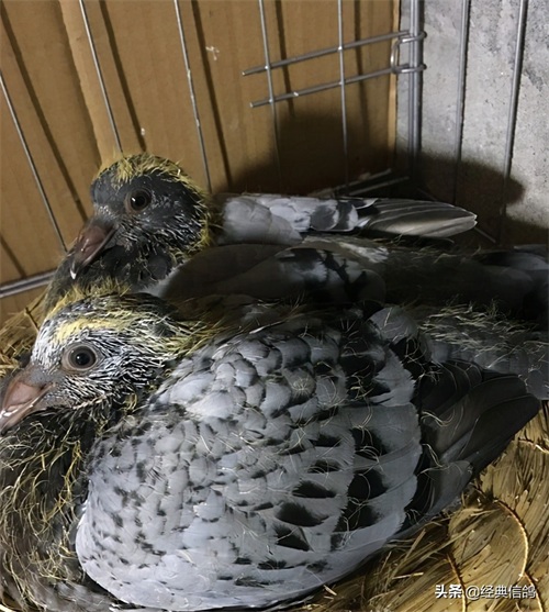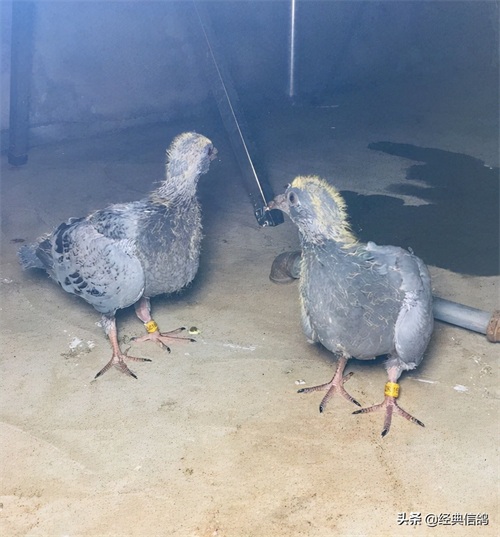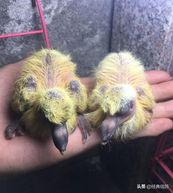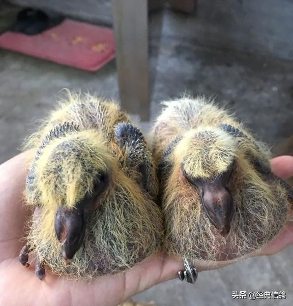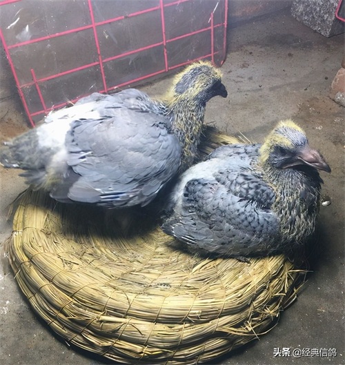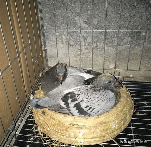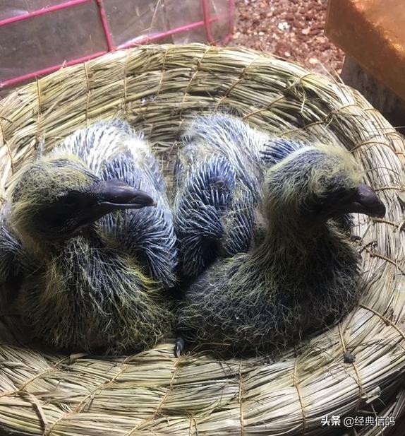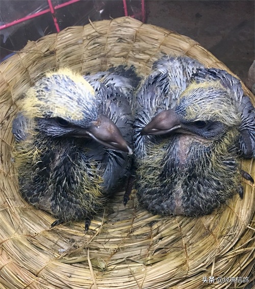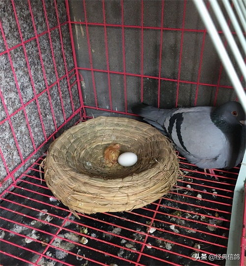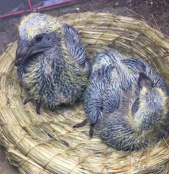 大的蛋是雄,小的蛋是雌,特地给蛋做了标记,方便以后验证,早上先出壳的是雌鸽,中午出壳的雄鸽。
