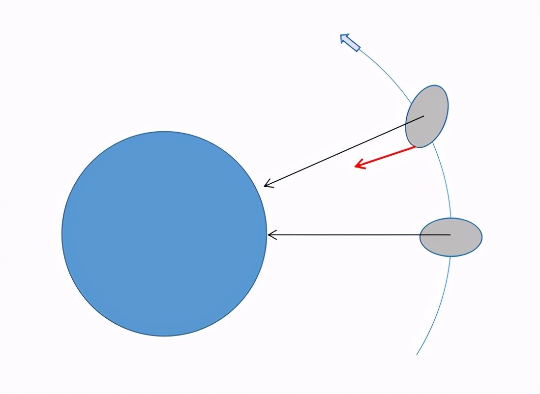 当月球自转周期与公转周期不一致时,月球上两端潮汐隆起的部分,其连线指向并不会时刻面向地球,而这样就会导致一个力矩产生,迫使其面向地球,如下图所示: