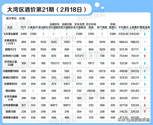 对比上期(2月6日),本期《大湾区酒价》多款白酒由涨转跌,其中飞天茅台为跌幅最大的白酒产品。本期飞天茅台的销售均价为2355元/瓶,对比上期下跌58元/瓶,主要受到百亿补贴频道与终端烟酒行的价格变动影响。飞天茅台在百亿补贴频道的价格从2121元/瓶降至2100元/瓶,在终端烟酒行的最新行情价从2450元/瓶降至2380元/瓶。