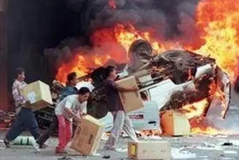 1998年5月13日 ,苏哈托为转移金融危机压力,缓和国内的民怨,通过军方情报部门策划煽动排华事件,有组织地迫害华人、强奸华人妇女,抢劫华侨财物。暴动持续约三天,数万名华裔受到有组织的虐待与杀害。始称“黑色五月暴动”。