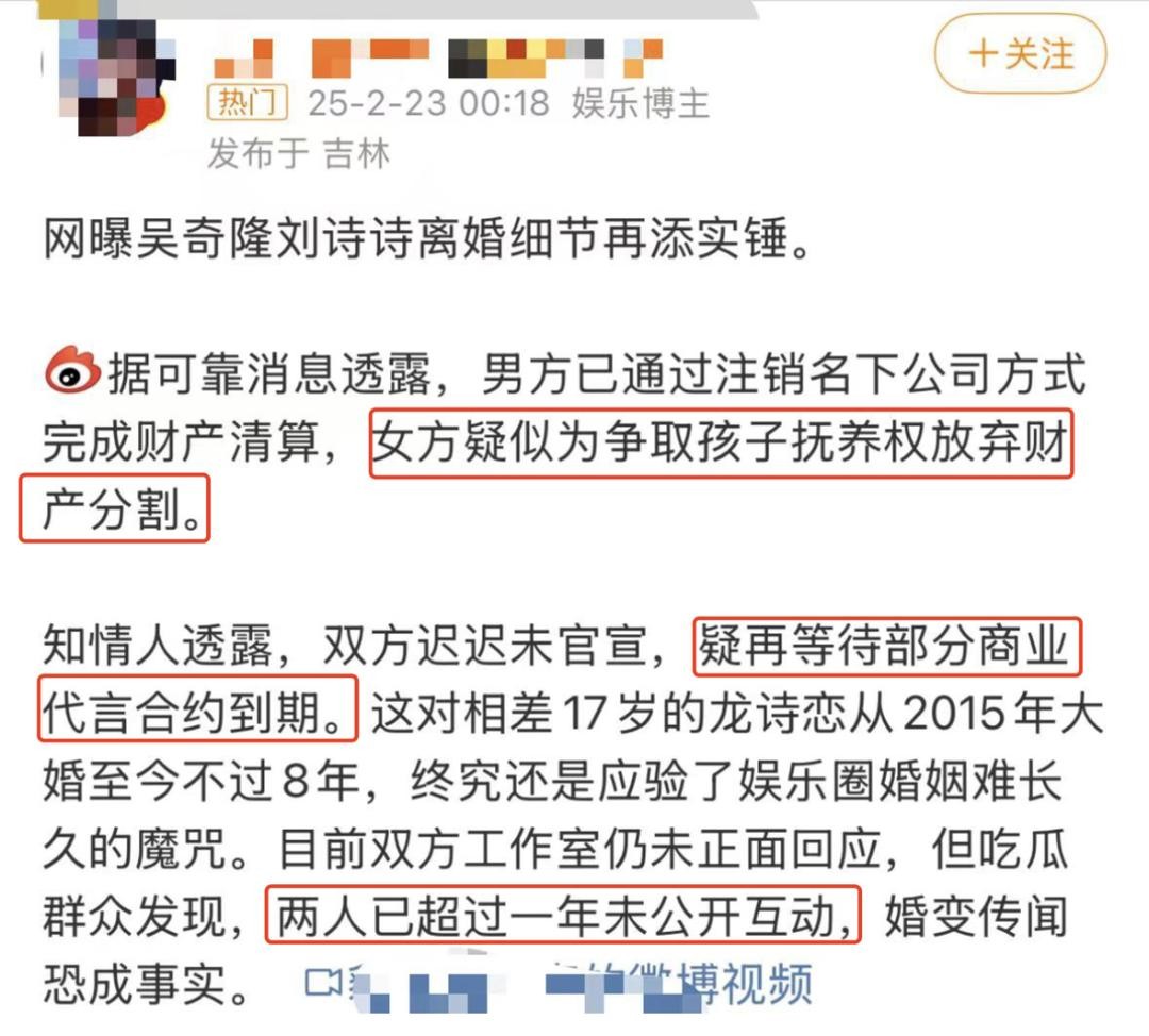 双方已经完成财产清算,未官宣是要等待部分商业d言合约到期,还涉及到孩子抚养权的问题。