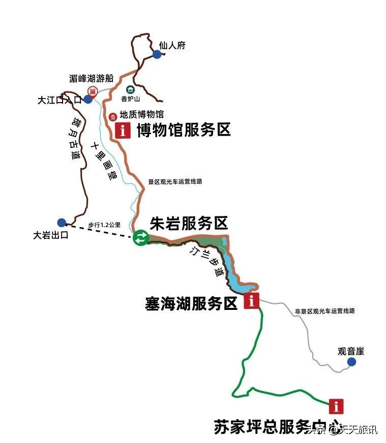游线推荐一:苏家坪停车场—摆渡—塞海湖服务区—汀兰步道—朱岩服务区—摆渡—博物馆—仙人府/湄峰湖—摆渡返回苏家坪停车场