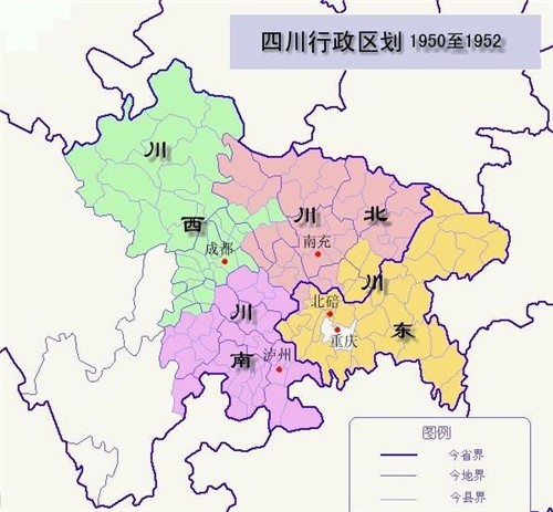 随着改革开放的进行,为了适应经济的发展,让三峡融入长江经济区。1997年,重庆市与地级市涪陵市、万县市、黔江地区从四川划出,它们成立了如今的重庆直辖市。从这之后,形成了如今的四川行政区域,川渝分治,当初的四个川便只剩下了两个川。