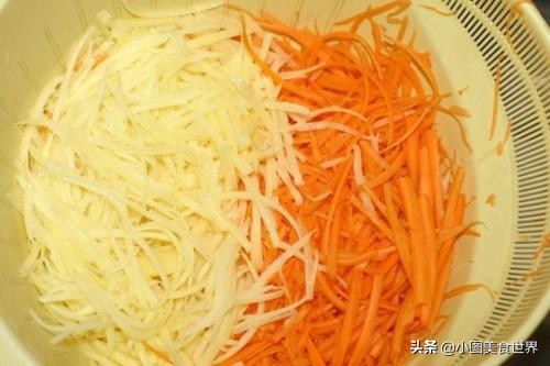 2、胡萝卜搽丝,土豆也要搽丝备用。土豆丝会氧化的要先搽胡萝卜。