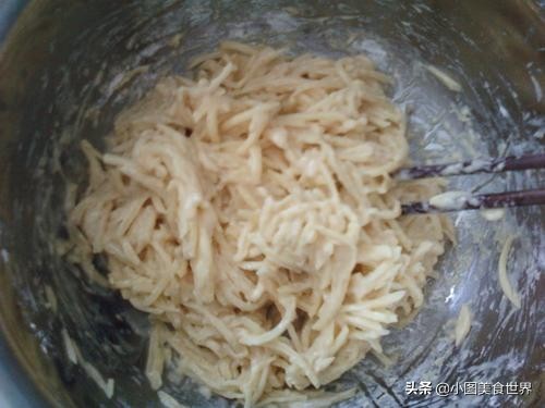 5、在搅拌好的土豆丝里面加入一杯面就搅拌均匀。记住面不要放太多,如果面多了,口感就不会很脆了。