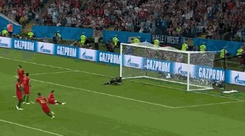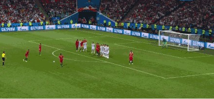 C罗在比赛最后时刻的任意球绕过跳起的布斯克茨和皮克头顶,直窜球门死角,德赫亚对这粒进球毫无反应。