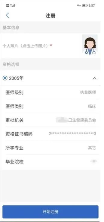 3、若无照片或需更换照片,可点击照片位置进行上传,上传成功后点击【开始注册】按钮。