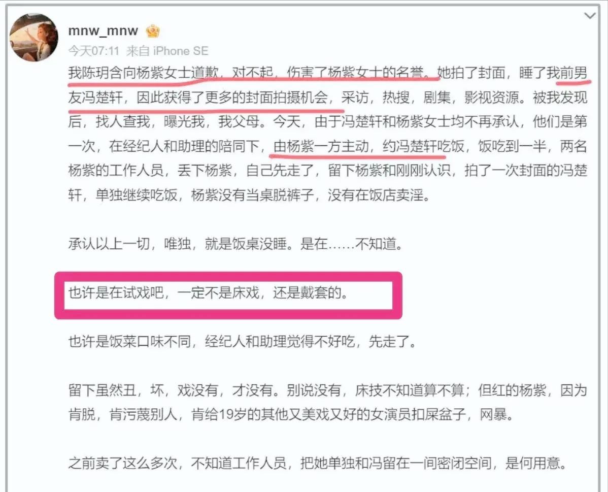 最近,娱乐圈的热搜几乎被杨紫所占据,然而这次并非因为她的新剧或新动态,而是由于一则恶意造谣引发的风波。一位自称为“MNW_MNW”的女网友发表了一篇“爆料”之文,宣称杨紫和某文化公司 CEO 冯楚轩关系不一般,还隐晦指出两人在某次饭局中有不当之举。