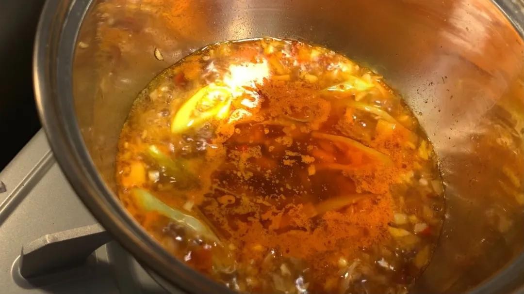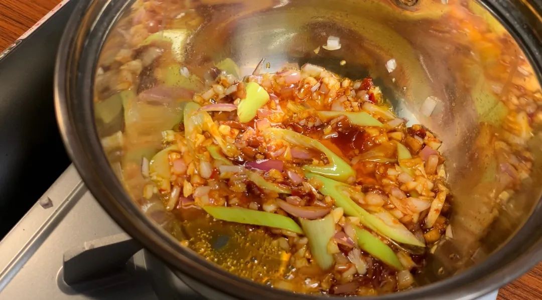 8.加一勺郫县豆瓣,翻炒出红油,加适量水,煮开;
