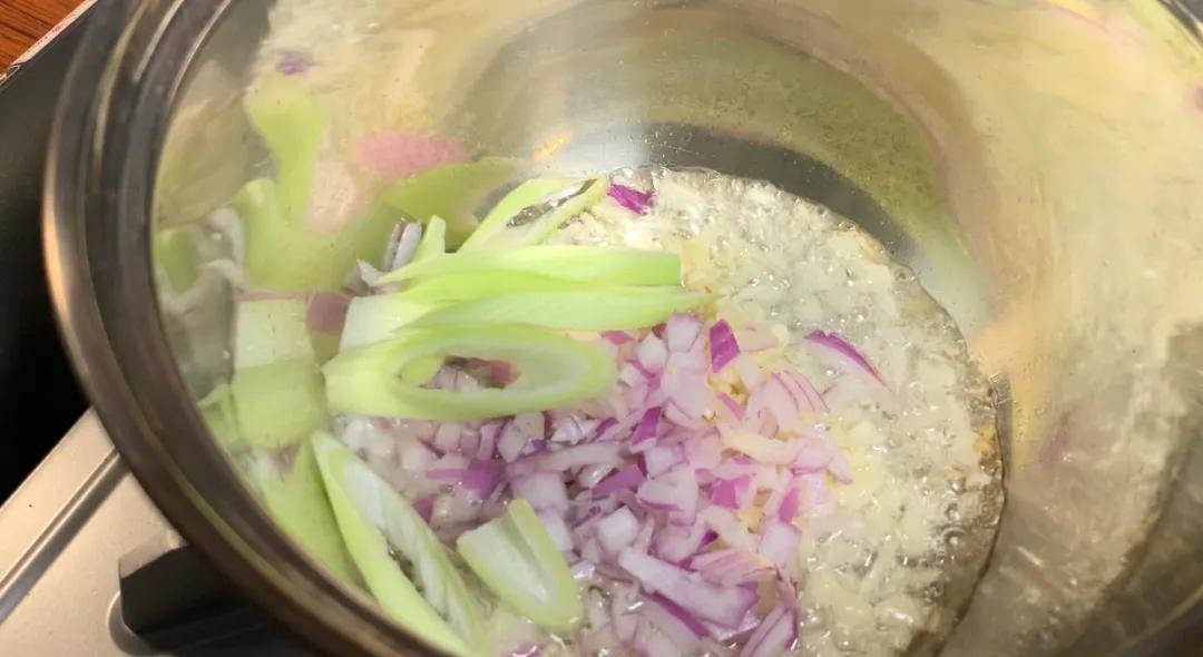7.热油,爆香蒜蓉、洋葱碎、大葱;