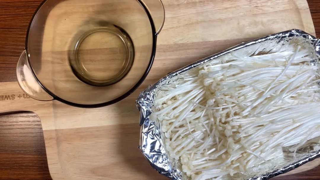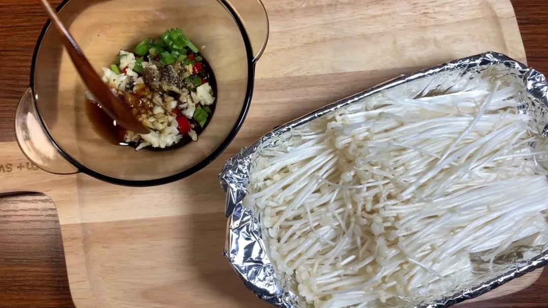 4. 烤盘铺好锡纸,摆好金针菇;