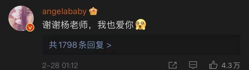 杨幂零点晒出她与baby的“同框”照,赞美对方并表白“今天你最好看,爱你”,语气完全就是闺蜜之间才有的亲昵。