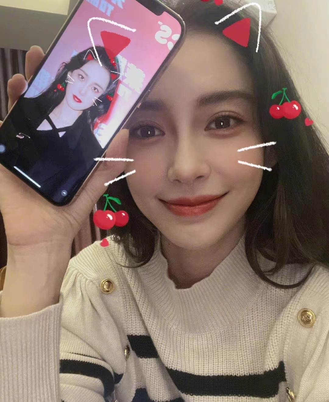 两人的合照中,baby身着居家的黑白条纹毛衣,一头长发披散在肩头,五官精致,一双芭比一样的大眼睛格外抢眼。她手里举着手机,而手机中正好是杨幂的照片,姐妹俩达成“同框”,画面很养眼。