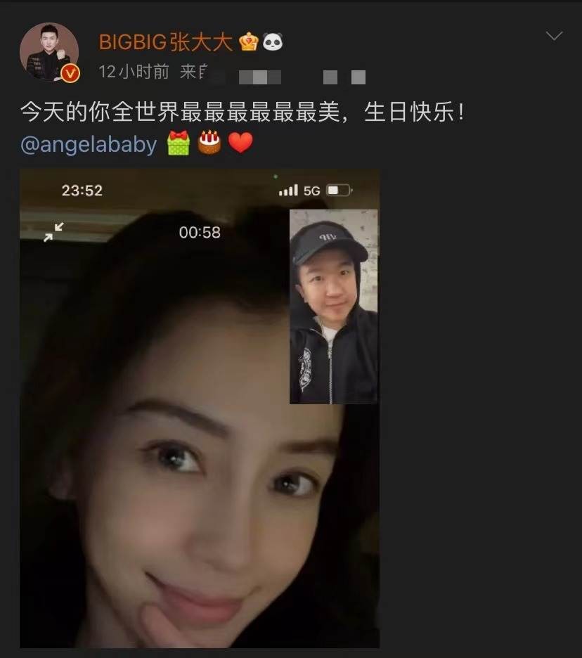 作为男闺蜜的张大大也在凌晨发文祝福,大赞对方“全世界最美丽”,张大大还晒出两人在当天晚上的视频通话截图,照片中的baby素颜亮相,很明显是在家中。
