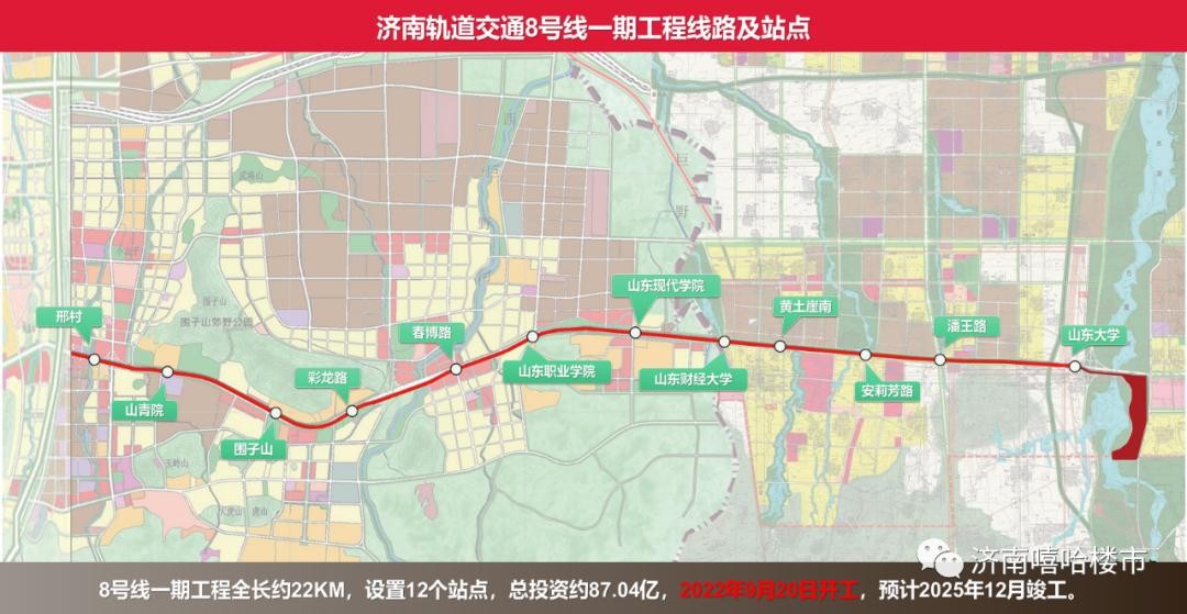下设【12】个站点:邢村-山青院-围子山-彩龙路-春博路-山东职业学院-山东现代学院-山东财经大学-黄土崖南-安莉芳路-潘王路-山东大学(一期不含 绣源河西-清源大街);预计2025年12月竣工。
