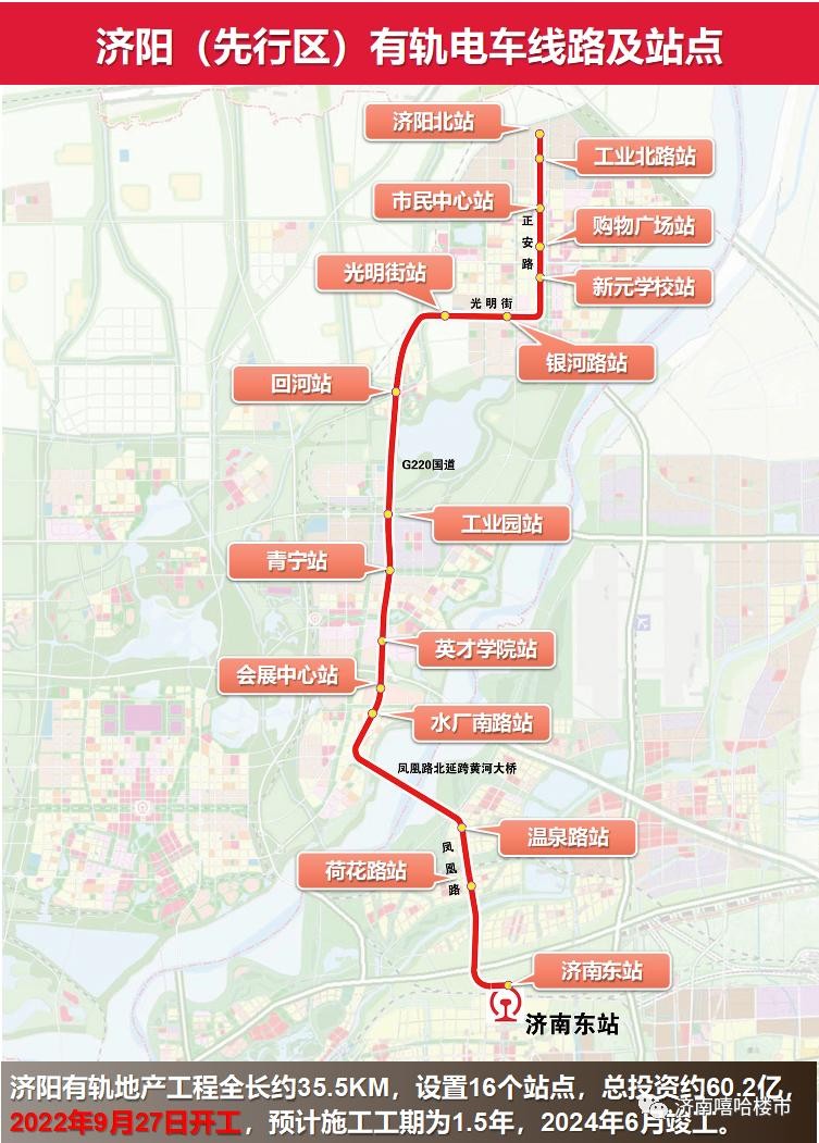 下设【16】个站点:济南东站-荷花路-温泉路-水厂南路-会展中心-英才学院-青宁-工业园-回河-光明街-银河路-新元学校-购物广场-市民中心-工业北路-济阳北站;预计2024年6月竣工。