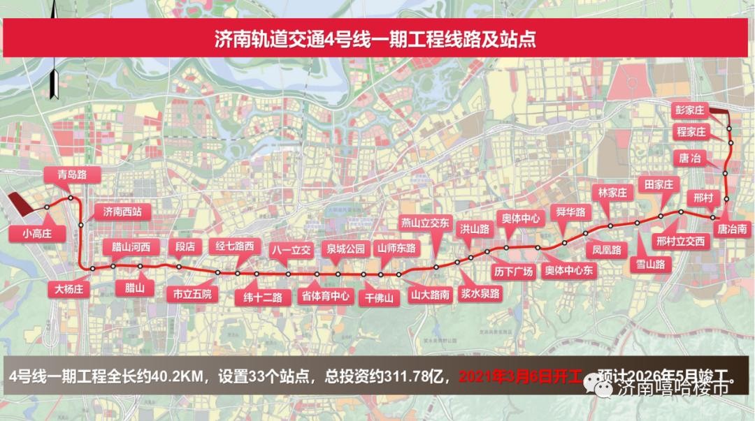 下设【33】个站点:小高庄-青岛路-济南西站-大杨-腊山河西-腊山-段店-市立五院-经七路西-纬十二路-八一立交桥-省体育中心-泉城公园-千佛山-山师东路-山大路南-燕山立交桥东-浆水泉路-洪山路-历下广场-奥体中心-奥体中心东-舜华路-凤凰路-林家庄-雪山路-田家庄-邢村立交桥西-邢村-唐冶南-唐冶-程家庄-彭家庄;预计2026年5月竣工。