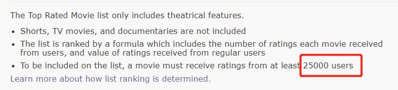 这个设定防止了某部电影只有狂热粉丝投票,或是大量新注册用户刷票,导致分数虚高的问题。同时也使得冷门电影和热门电影有了可比性。