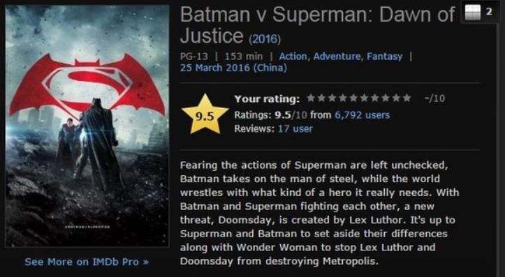 此后每有DC电影上映,就会有一大批DC粉丝到IMDb上无脑给出10分好评,这也导致了DC电影总是有着“开评9分”的“好成绩”。