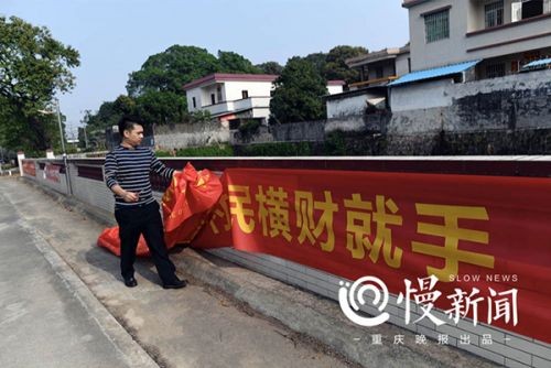关塘村工作人员在清理汽车经销商“祝贺村民横财就手”的条幅。