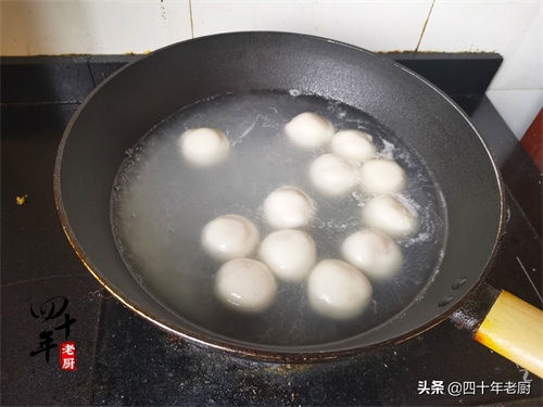 要想炸出金黄圆润、酥脆香甜的汤圆,首先要解决汤圆的成熟问题。人们在家炸汤圆,如果直接炸,汤圆还没有成熟,就已经炸开了花。因此,炸汤圆前要做的第一步就是把汤圆先煮八九成熟,炸的时候,就简单多了,只炸其表就相对容易,也省事多了。把汤圆从冰箱拿出来,室温搁置回温,这边锅内加水,煮开后把汤圆下入。全程中火,煮开2次,分别添加少量清水,再次煮开后,汤圆也就七八成熟了。把汤圆捞到有足量凉水的大碗内过一下凉,通过快速降温,使汤圆表面圆润不粘连。