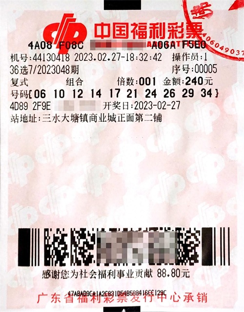 2023年2月27日晚,中国福利彩票南粤风采“36选7”第2023048期开奖。本期广东省中出一等奖1注,单注奖金5000000元,花落佛山市第44130418号投注站。
