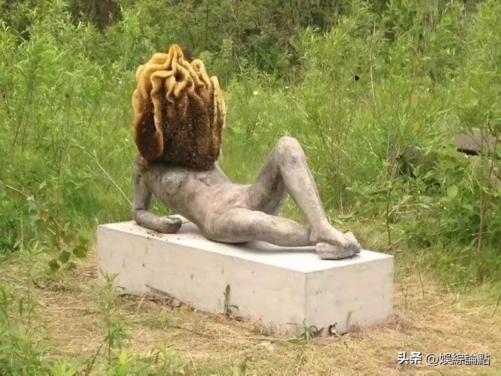 蜜蜂在雕像的头部筑巢了,画面看起来非常诡异。