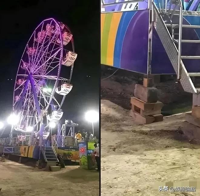 当地夜市中,一座未加固安全的摩天轮在灯光照耀下缓慢旋转,营造出神秘莫测的氛围。