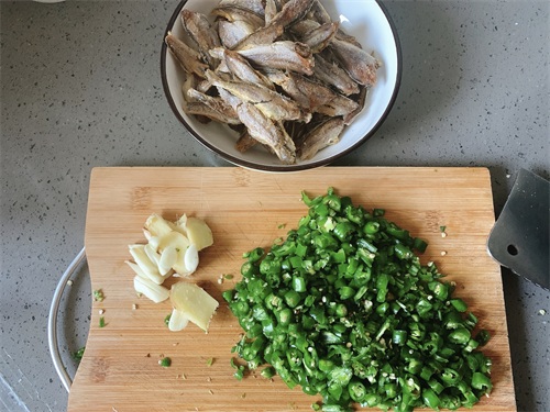 小鱼干是即食的零食,不用洗,青椒切碎,姜蒜切片。