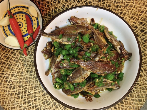 食材:小鱼干、青椒、姜蒜