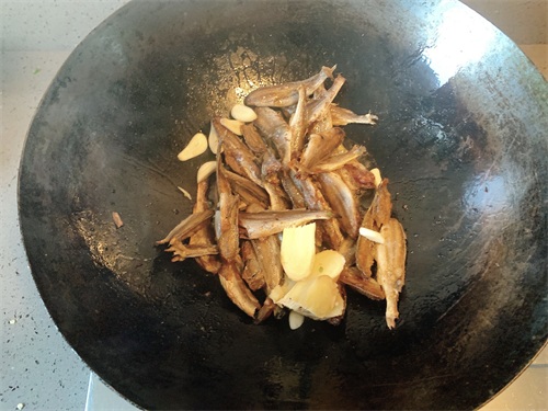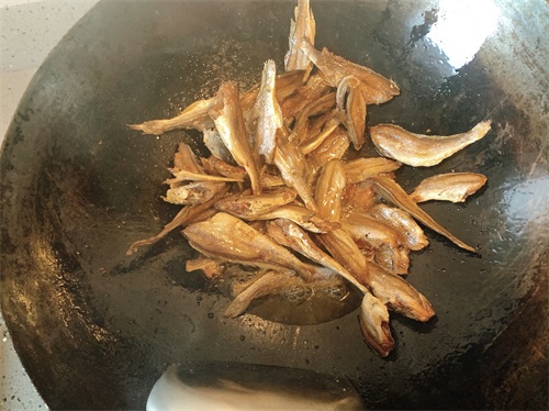 热锅放菜籽油,油温7、8成下小鱼干翻炒。