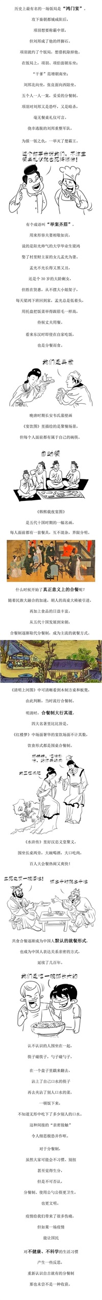 被“封印”在家的你,一日三餐是咋解决的?近来各地都在倡议分餐制。是分,是合,你还在纠结吗?那就让历史来治愈你吧!分分合合的中国历史,也从一个侧面见证了合餐制、分餐制的“饭圈”文化。(点击看长图)
