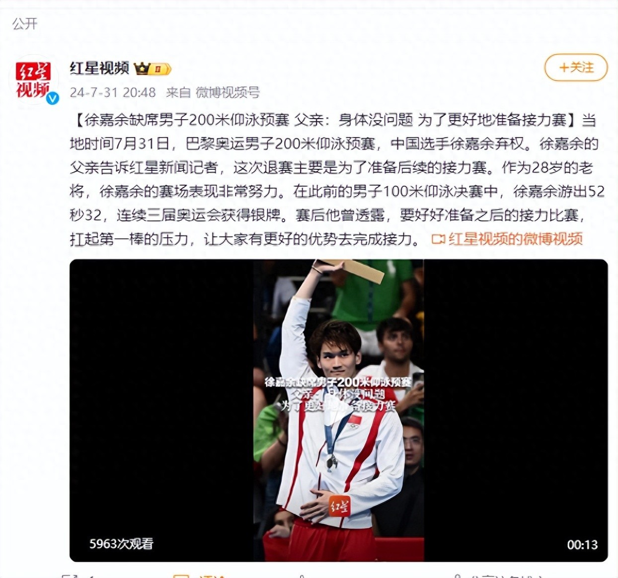 当地时间7月31日,巴黎奥运男子200米仰泳预赛,中国选手徐嘉余弃权。徐嘉余的父亲告诉红星新闻记者,这次退赛主要是为了准备后续的接力赛。作为28岁的老将,徐嘉余的赛场表现非常努力。在此前的男子100米仰泳决赛中,徐嘉余游出52秒32,连续三届奥运会获得银牌。赛后他曾透露,要好好准备之后的接力比赛,扛起第一棒的压力,让大家有更好的优势去完成接力。