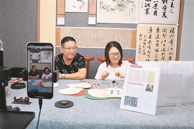在李园村电商服务中心(一期)二楼直播间,主播正在直播带货,售卖该村的宣纸文房四宝产品。闫 顺摄