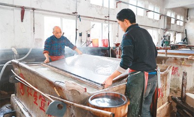 两位师傅正在生产车间纸浆池旁捞纸。一掌一抬,在配好的纸浆槽中一深二浅两次捞造后,宣纸即呈现在纸帘之上。王德强摄