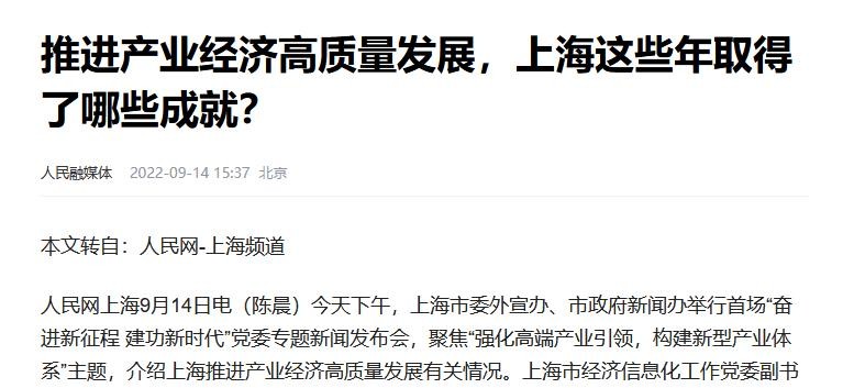 人民融媒体,2022-09-14,关于《推进产业经济高质量发展,上海这些年取得了哪些成就?》的报道
